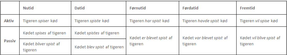 Aktiv- og passiv-formen af verber kan bruges i flere grammatiske tider:
